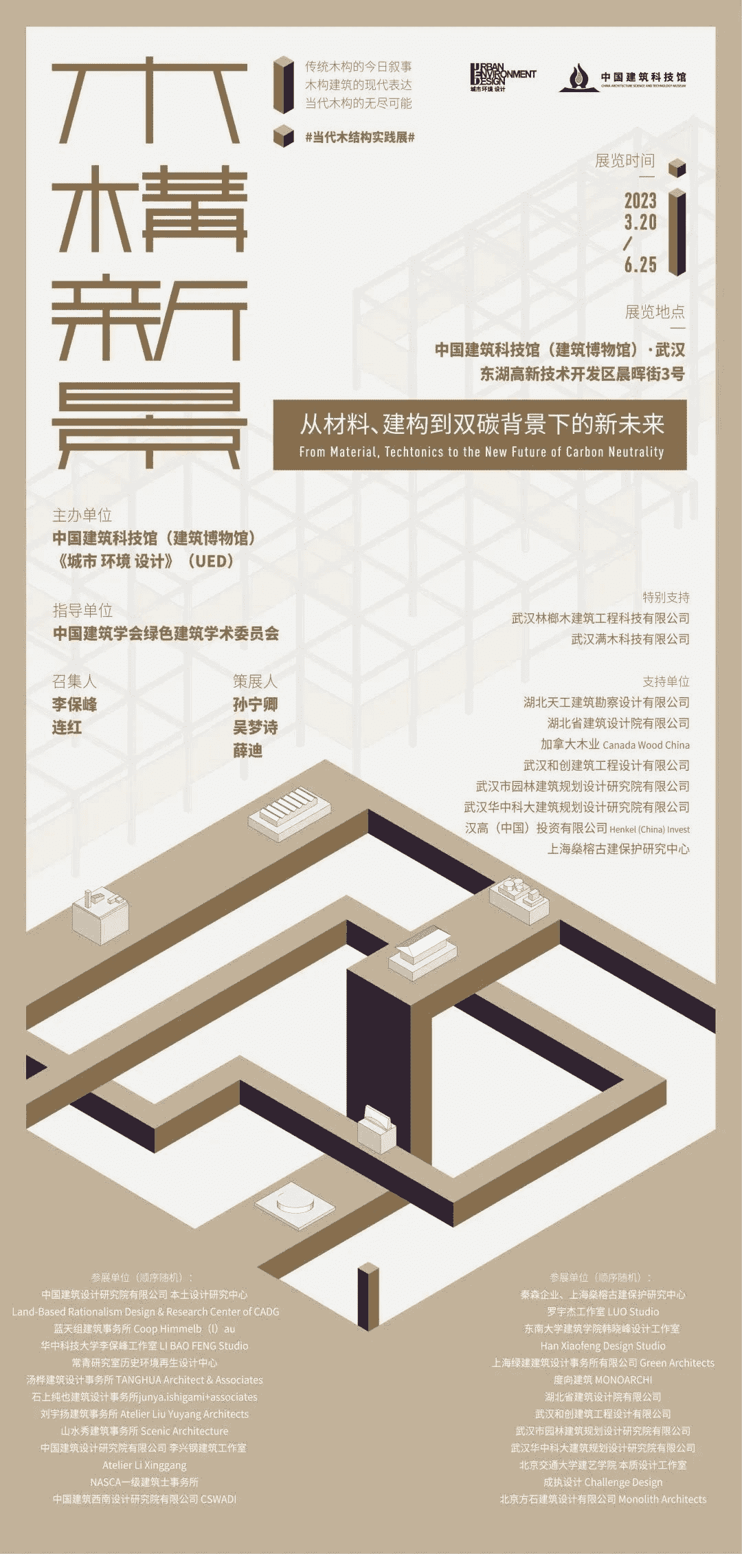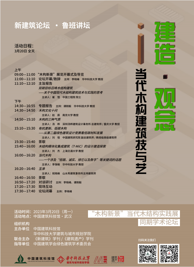 由湖北天工建筑勘察设计有限公司牵头支持,李保峰大师召集,《城市 环境 设计》杂志和中国建筑科技馆主办的“木构新景:当代木结构实践展”将于3月20日至6月25日在武汉中国建筑科技馆举办,主题是:从材料、建构到双碳背景下的新未来!